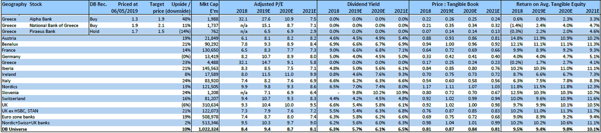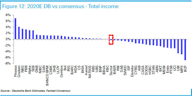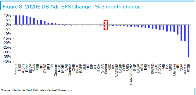 Μάλιστα, η γερμανική τράπεζα κατατάσσει και τις τρεις ελληνικές τράπεζες (δεν καλύπτει τη Eurobank λόγω του ρόλου της ως συμβούλου στο deal με τη Grivalia) ανάμεσα σε εκείνες που είδαν τις πιο θετικές προσαρμογές για τις εκτιμήσεις που αφορούν τα κέρδη ανά μετοχή του 2020.
