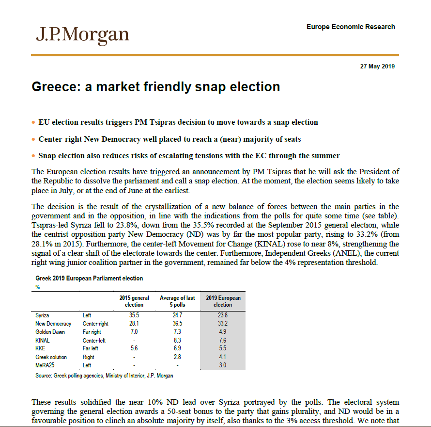 Ως «φιλικές προς την αγορά» χαρακτηρίζει τις πρόωρες εκλογές στην Ελλάδα η J.P. Morgan σε δισέλιδο report της, με τίτλο «Ελλάδα: φιλικές προς την αγορά πρόωρες εκλογές» («Greece: a market friendly snap election»), την οποία σας παρουσιάζει το bankingnews.gr, στο οποίο αναφέρεται τόσο στα τεκταινόμενα σε πολιτικό επίπεδο όσο και στο τι μπορεί να σημάνει μία νίκη της Νέας Δημοκρατίας σε αυτές.
