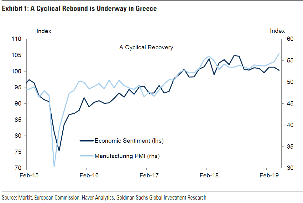 Στο μέτωπο της οικονομίας, η Goldman Sachs επισημαίνει ότι στην Ελλάδα βρίσκεται σε εξέλιξη μια κυκλική ανάκαμψη, η οποία υποστηρίζεται από την αύξηση της εμπιστοσύνης των καταναλωτών και των επιχειρήσεων και τη χαλάρωση των οικονομικών συνθηκών.