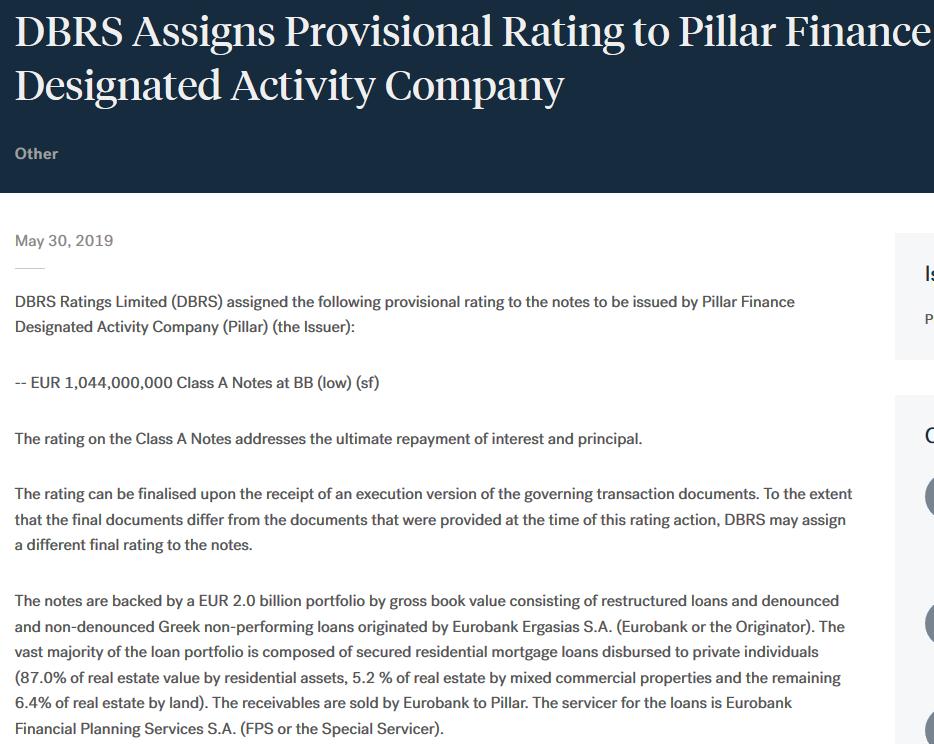 Η πρώτη ελληνική τιτλοποίηση που παίρνει rating είναι γεγονός, με την DBRS να αξιολογεί το senior ομόλογο που θα εκδοθεί από το Pillar με ΒΒ (low).