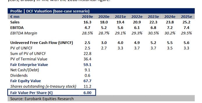 Η εξέλιξη αυτή ενισχύεται και από την εκτίμηση της δίκαιη αποτίμησης με βάση την αποτίμησης DCF, με αποτέλεσμα την εύλογη αξία της εταιρία (κεφαλαιοποίηση) στα 67 εκατ. - 68 εκατ. – τρέχουσα κεφαλαιοποίηση 37,32 εκατ. - (5,9 ευρώ - 6 ευρώ ανά μετοχή, εξαιρουμένων των ιδίων μετοχών).