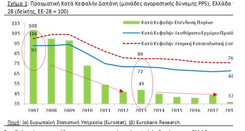 Τέλος, σε όρους κατά κεφαλήν επένδυσης παγίων, η ελληνική οικονομία από το 108% της ΕΕ-28 το 2007 κινήθηκε καθοδικά και απότομα στο 49% το 2013 και στο 37% το 2018.