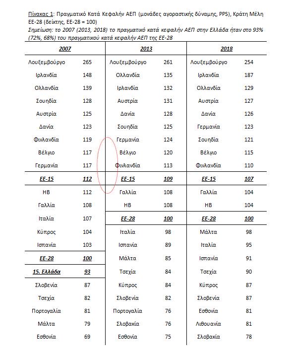 Το 2007, το πραγματικό κατά κεφαλήν ΑΕΠ στην Ελλάδα αντιστοιχούσε στο 93% της ΕΕ-28. Έπειτα από 6 χρόνια βαθιάς ύφεσης το αντίστοιχο μέγεθος μειώθηκε σωρευτικά στο 72% και βάσει των τελευταίων στοιχείων διαμορφώθηκε στο 68% το 2018. Η ελληνική οικονομία, σε όρους πραγματικού κατά κεφαλήν ΑΕΠ, από την 15η θέση ανάμεσα στις χώρες της ΕΕ-28 το 2007 διολίσθησε στην 22η το 2013 και στην 25η το 2018 (βλέπε Πίνακα 1).