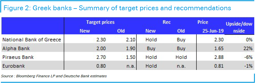Σε αύξηση των τιμών στόχων των ελληνικών τραπεζών προχώρησε η Deutsche Bank, αλλά κράτησε τη σύσταση buy (αγορά) μόνο για τη μετοχή της Alpha Bank, καθώς η προσαρμογή υποδηλώνει ότι δεν υπάρχουν περιθώρια περαιτέρω ανόδου.