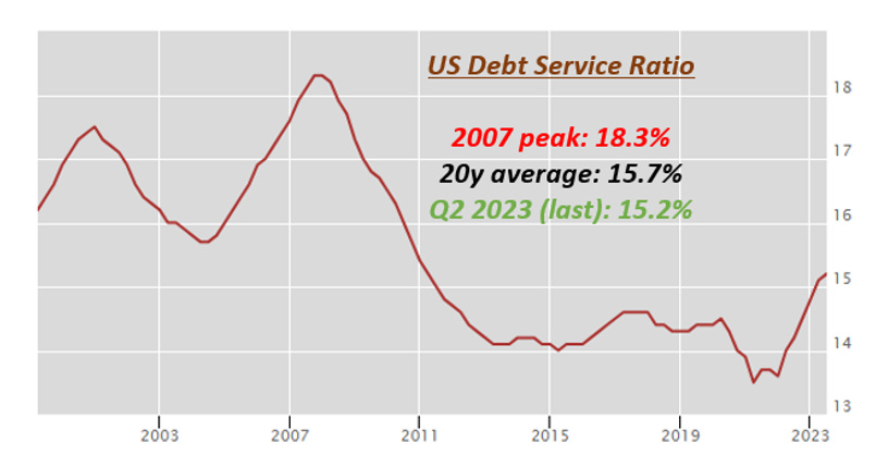 Ο δείκτης εξυπηρέτησης του χρέους των ΗΠΑ ανεβαίνει αργά: βρίσκεται στο 15% που ισοδυναμεί με τον μακροπρόθεσμο μέσο όρο του.