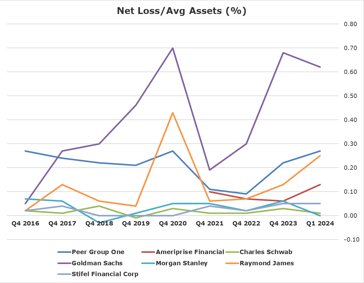 Τα συνολικά δάνεια και μισθώσεις για την GS ήταν μόνο 256 δισεκατομμύρια δολάρια από τα 1,6 τρισεκατομμύρια δολάρια σε συνολικό ενεργητικό το α' τρίμηνο του 2024, ωστόσο η τράπεζα έχασε 62 μονάδες βάσης έναντι των συνολικών περιουσιακών στοιχείων το α' τρίμηνο του 2024.