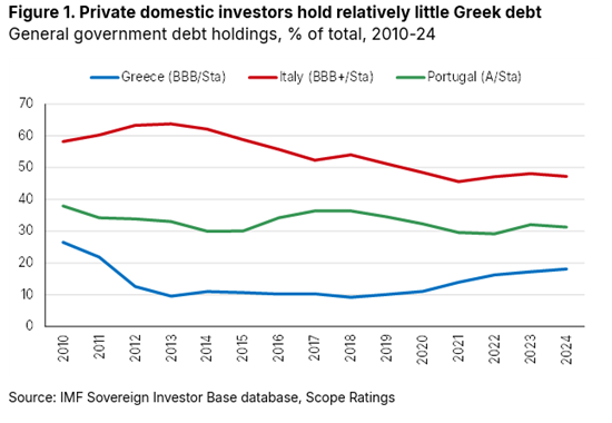 Η σύγκριση με χώρες όπως η Ιταλία και η Πορτογαλία είναι ενδεικτική: η Ιταλία, αν και έχει υψηλότερο κόστος εξυπηρέτησης και μικρότερη μέση διάρκεια χρέους, στηρίζεται σε μια ισχυρή και ρευστή εγχώρια αγορά, με αποτέλεσμα μεγαλύτερη ευελιξία. Αντίθετα, η Ελλάδα στερείται ακόμη ευρείας συμμετοχής από τράπεζες, ασφαλιστικά ταμεία και νοικοκυριά στην εγχώρια αγορά κρατικού χρέους.