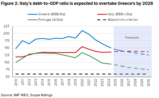 Το δημόσιο χρέος μειώθηκε από το εντυπωσιακό 210% του ΑΕΠ το 2020 στο 153,6% το 2024, με την Scope να εκτιμά περαιτέρω αποκλιμάκωση στο 125% έως το 2030 – επίπεδο σημαντικά χαμηλότερο από αυτό της Ιταλίας, που αναμένεται να κινηθεί στο 137% την ίδια χρονιά.