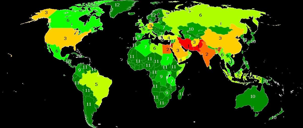 Ο παγκόσμιος χάρτης με τις διαβαθμίσεις της έντασης της παρακολούθησης από την NSA διαβαθμισμένης με χρώματα, όπου το 1 (άλικο) σημειώνει το υψηλότερο και το 12 (βαθύ πράσινο) το χαμηλότερο. Η μυστική υπηρεσία χρησιμοποιεί το λογισμικό ανάλυσης και οπτικοποίησης μεγάλων όγκων δεδομένων BOUNDLESS INFORMANT, με δυνατότητα να συλλέγει ανά 30 ημέρες 97 δισεκατομμύρια αρχεία του διαδικτύου (Ιnternet Data Records-DNI) και 124 δισεκατομμύρια τηλεφωνικά αρχεία (Telephony Data Records-DNR). Στην διαβάθμιση 1 εντάσσονται η Περσία, το Πακιστάν και η Παλαιστίνη και παραδόξως όχι οι περιοχές του ισλαμικού κράτους που εμφανίζουν διαβάθμιση 3 (πορτοκαλί), όπως οι ΗΠΑ, η Γερμανία, η Σαουδική Αραβία, το Αφγανιστάν και η Κίνα. Η Ελλάδα όπως είναι ευνόητο, αποτελεί μία διαβάθμιση μόνη της (8) που δεν επαναλαμβάνεται σε καμμία άλλη ζώνη (Iamthechitt).