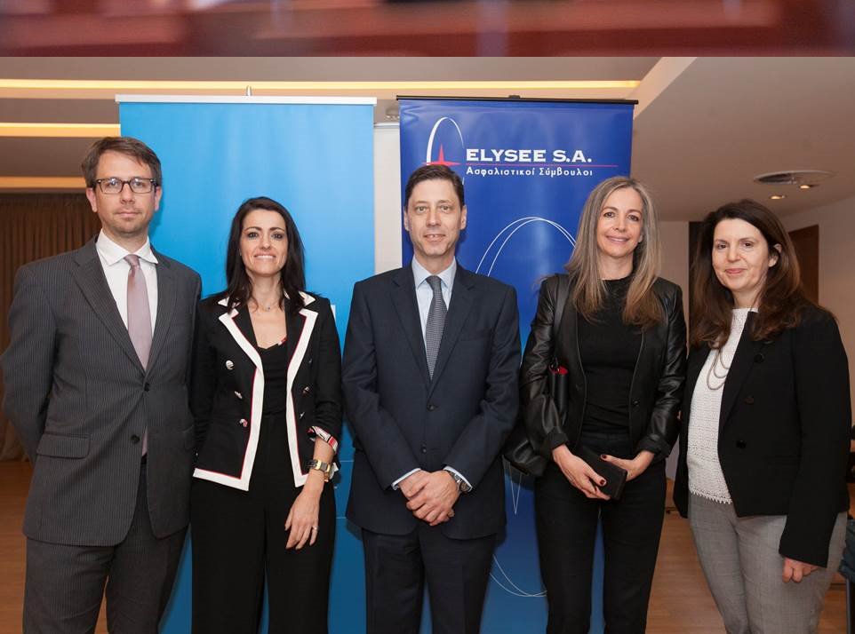 Από αριστερά: Κώστας Βούλγαρης (Financial Lines & Casualty Manager AIG Ασφαλιστική), Σωτηρία Μαράκη (Distribution Manager, Consumer Lines AIG Ασφαλιστικής), Μπάμπης Μωραΐτης (Διευθύνων Σύμβουλος ΕΛΥΖΕ Α.Ε. και Γεν. Γραμματέας Ε.Β.Ε.Α.), Ναταλία Καρπούζογλου (Μέλος ΔΣ ΕΛΥΖΕ Α.Ε.), Μαργαρίτα Γκολφινοπούλου (Commercial Lines Director AIG Ασφαλιστικής)