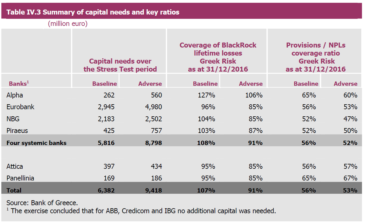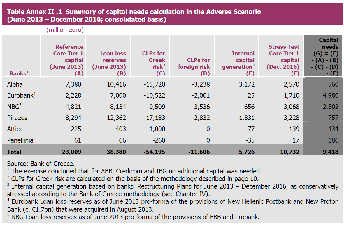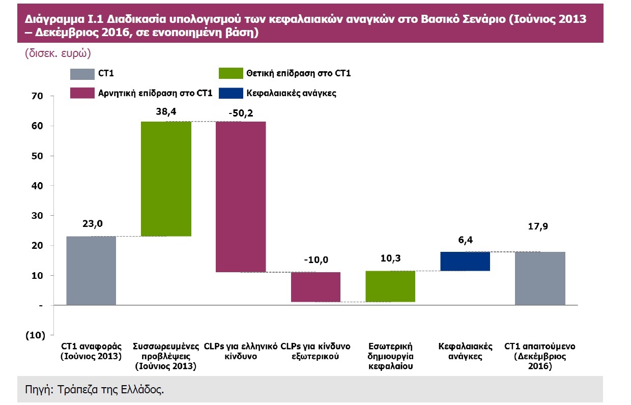 Η Τράπεζα της Ελλάδος θεωρεί ότι, μέσα σε φυσιολογικά επίπεδα οικονομικής αβεβαιότητας, οι εκτιμηθείσες κεφαλαιακές ανάγκες για τον χρονικό ορίζοντα της άσκησης (Ιούνιος 2013-Δεκέμβριος 2016) καλύπτονται από αποθέματα ασφαλείας που έχουν ήδη ενσωματωθεί στην άσκηση και ενέργειες περιορισμού των κεφαλαιακών αναγκών (π.χ. τη συμμετοχή του ιδιωτικού τομέα σε μελλοντικές αυξήσεις μετοχικού κεφαλαίου, την αναγνώριση αναβαλλόμενης φορολογίας, την πώληση στοιχείων ενεργητικού, κ.λπ.), καθώς και από τα κονδύλια του ΤΧΣ που δεν έχουν ακόμη χρησιμοποιηθεί.