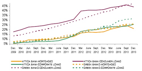 ΔΙΑΓΡΑΜΜΑ 2: ΔΕΙΚΤΗΣ ΔΑΝΕΙΩΝ ΣΕ ΚΑΘΥΣΤΕΡΗΣΗ ATTICA BANK-ΤΡΑΠΕΖΙΚΟ ΣΥΣΤΗΜΑ 2009-2013