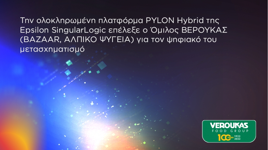 Ο Όμιλος εταιριών ΒΕΡΟΥΚΑΣ και η BAZAAR A.E.,, μέλος του Ομίλου, επέλεξαν το PYLON Hybrid της Epsilon SingularLogic, μέλος του Ομίλου EPSILON NET, μετά από πολύμηνη και ιδιαίτερα ενδελεχή αξιολόγηση σε ελληνικά και διεθνή ολοκληρωμένα συστήματα, στο πλαίσιο αναζήτησης μιας ολοκληρωμένης λύσης ERP-HRMS-CRM-WMS-ECOMMERCE και Ηλεκτρονικής τιμολόγησης, που θα καλύπτει τις ανάγκες όλων των εταιριών και διευθύνσεων του Ομίλου, προσφέροντάς τους διατμηματική επικοινωνία.