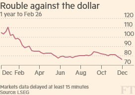 Αξίζει να σημειωθεί πως το 2014, το ρωσικό νόμισμα έχασε περίπου το 50% της αξίας του έναντι του δολαρίου, αγγίζοντας και τα 71,9 ρούβλια ανά δουλάριο.