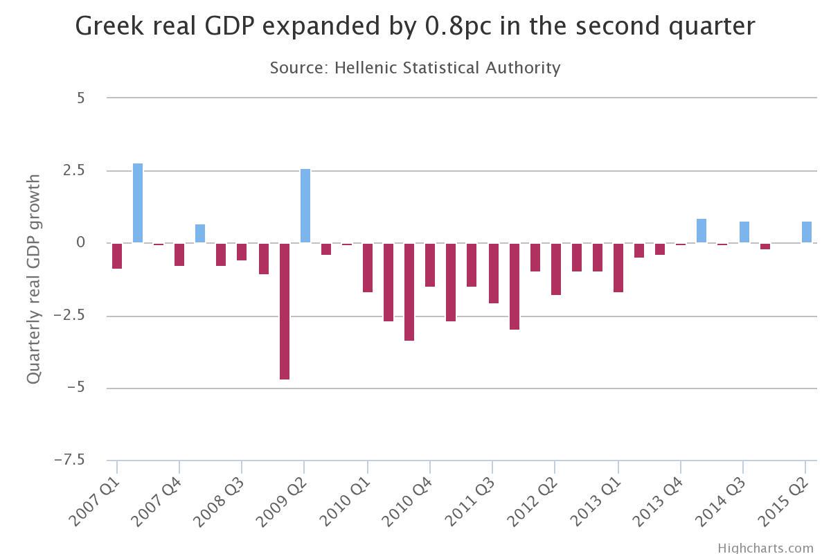 Η Ελλάδα εξέπληξε σήμερα, Πέμπτη 13 Αυγούστου, τις αγορές, καθώς οι επίσημες αρχές ανακοίνωσαν ότι η οικονομία της χώρας αυξήθηκε κατά 0,8% το β’ τρίμηνο του 2015, επισημαίνει σε σημερινό της δημοσίευμα, η βρετανική εφημερίδα Telegraph.