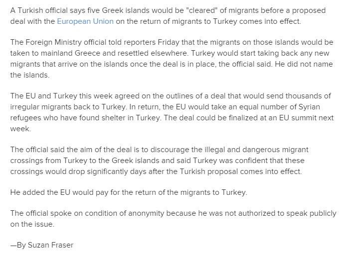 Ότι πέντε ελληνική νησιά θα εκκενωθούν από τους πρόσφυγες, προτού τεθεί σε εφαρμογή η συμφωνία της Τουρκίας με την Ευρωπαϊκή Ένωση για την επανεισδοχή προσφύγων και μεταναστών.