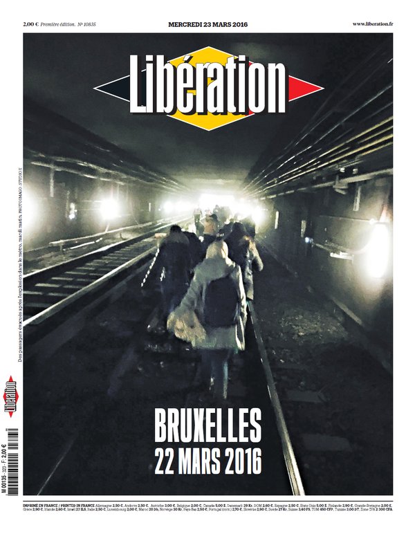 Η γαλλική Liberation έντυσε το λογότυπό της στα χρώματα της σημαίας του Βελγίου, ενώ στο πρωτοσέλιδο φιγουράρει μια συγκλονιστική φωτογραφία από τις σήραγγες του μετρό των Βρυξελλών.