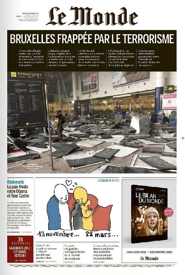 Η γαλλική Le Monde, δημοσιεύει στο πρωτοσέλιδο μια φωτογραφία από το χάος που επικράτησε στο αεροδρόμιο των Βρυξελλών, μετά τη βομβιστική επίθεση.