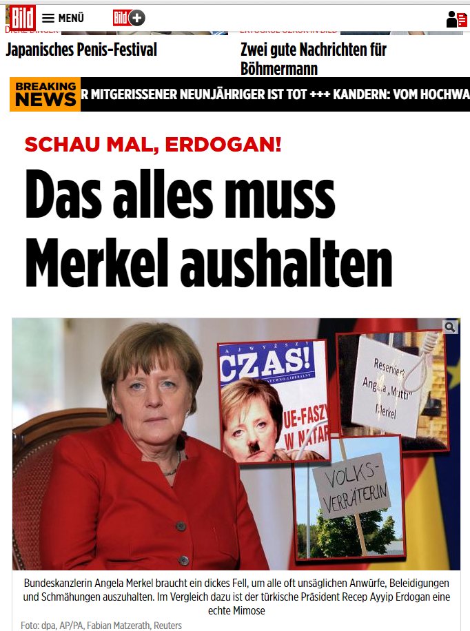 «Κοίτα Erdogan, όλα αυτά πρέπει να τα υπομένει η Μerkel», αναφέρει στο δημοσίευμά της η Bild, η οποία δημοσιεύει περιστατικά και φωτογραφίες από τις επιθέσεις που έχει δεχθεί η καγκελάριος στην Ευρώπη, κυρίως από τους Έλληνες.