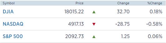 Αναλυτικότερα, ο βιομηχανικός δείκτης Dow Jones διαμορφώνεται στις 18.015,22 μονάδες, με άνοδο 0,18%, ενώ ο S&P 500 κινείται οριακά ανοδικά (+0,06%), στις 2.092,73 μονάδες.