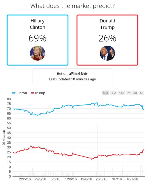 Όπως δείχνουν και τα πονταρίσματα (πηγή: betfair) των τελευταίων 60 ημερών, η Δημοκρατική υποψήφιος απολαμβάνει προβάδισμα +43%, συγκεντρώνοντας το 69% έναντι 26% του εκκεντρικού Ρεπουμπλικάνου.