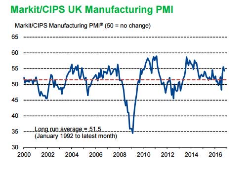 Συγκεκριμένα, ο δείκτης PMI βρέθηκε στις 54,3 μονάδες, έναντι 55,5 μονάδων τον Σεπτέμβριο του 2016, παραμένοντας αρκετά υψηλότερα από τον μέσο όρο των 51,5 μονάδων.