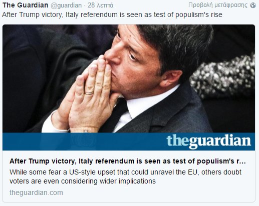 Μετά την επικράτηση του Brexit στο βρετανικό δημοψήφισμα και τη νίκη του Donald Trump στις προεδρικές εκλογές των ΗΠΑ, το δημοψήφισμα στην Ιταλία αποτελεί ένα τεστ για την άνοδο του λαϊκισμού, σημειώνει ο Guardian.