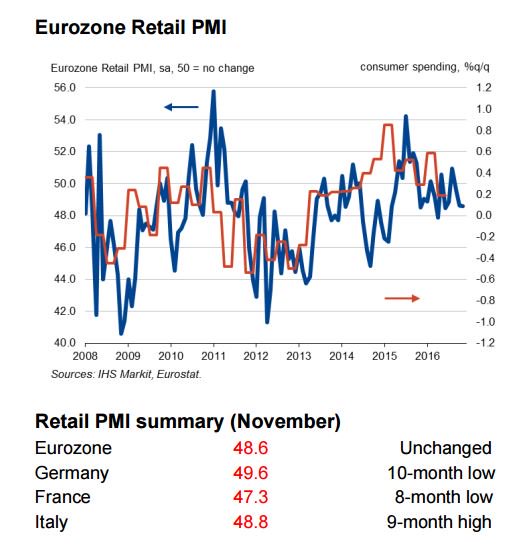 Συνεχίζεται για τρίτο συνεχόμενο μήνα η ύφεση στον κλάδο λιανικών πωλήσεων στην Ευρωζώνη τον Νοέμβριο 2016, όπως μαρτυρά ο δείκτης της Markit, με την πτώση να αφορά και τις τρεις κύριες οικονομίες ανάμεσα στις χώρες του ευρώ.