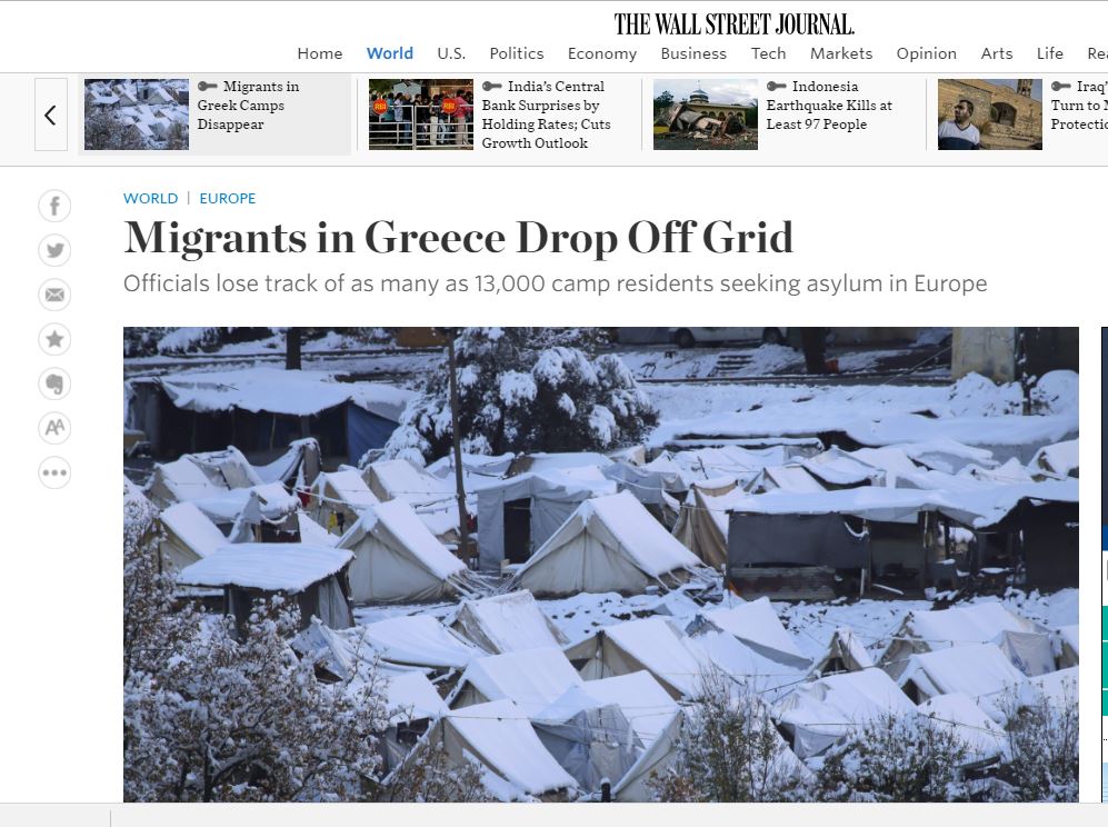 Περίπου 13.000 πρόσφυγες και μετανάστες αγνοούνται από τις δομές φιλοξενίας της χώρας μας, σύμφωνα με τα στοιχεία περιλαμβάνονται σε σημερινό (7/12) δημοσίευμα της Wall Street Journal.