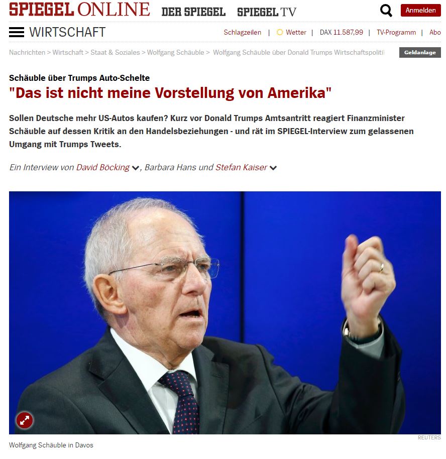 Το γάντι που του έριξε πρόσφατα ο εκλεγμένος πρόεδρος των ΗΠΑ Donald Trump σήκωσε ο Γερμανός υπουργός Οικονομικών Wolfgang Schaeuble, λίγες ώρες πριν την ορκωμοσία του πρώτου.