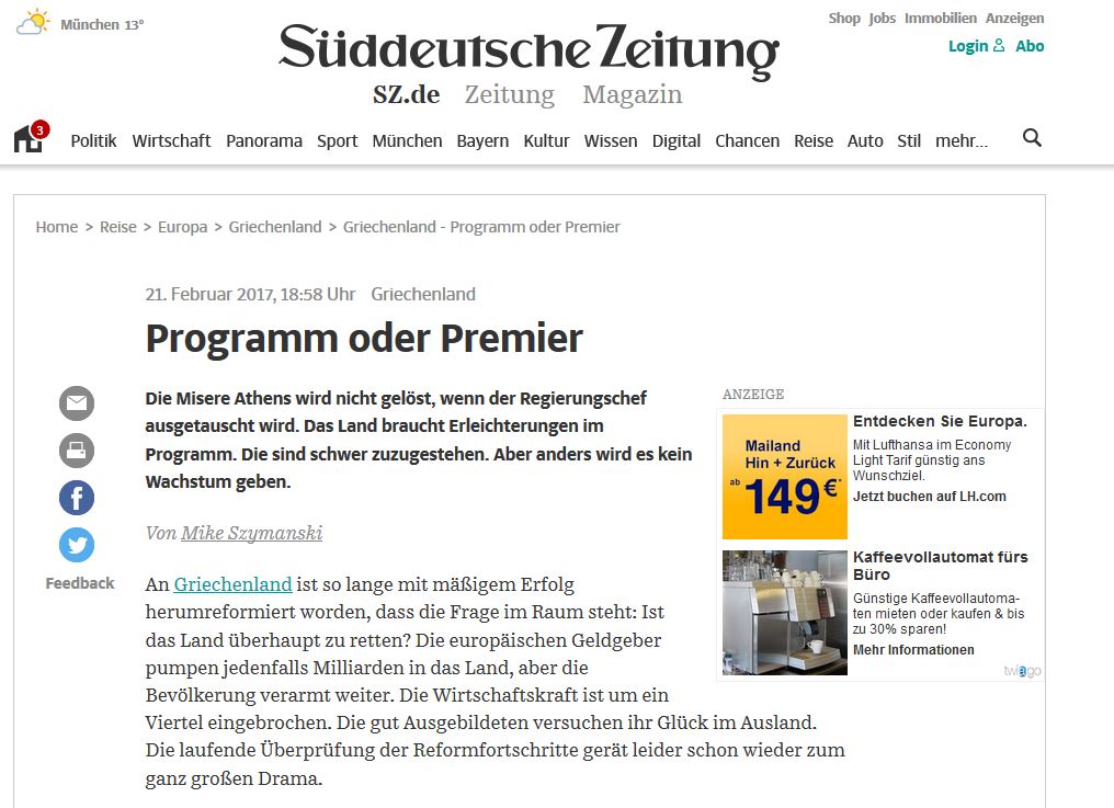 υτή την ψευδαίσθηση δεν πρέπει να έχει κανείς στο Βερολίνο» υπογραμμίζει το σχετικό δημοσίευμα που έχει τίτλο «Τήρηση του προγράμματος ή νέος πρωθυπουργός».