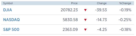 Στα της συνεδρίασης, ο βιομηχανικός δείκτης Dow Jones υποχωρεί κατά 0,19%, στις 20.782,23 μονάδες.