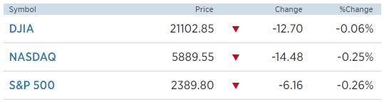 Στα της συνεδρίασης, ο βιομηχανικός δείκτης Dow Jones υποχωρεί οριακά (-0,06%), στις 21.2012,85 μονάδες.