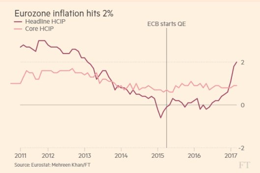 Σε δίλημμα βρίσκεται ο διοικητής της ΕΚΤ, Mario Draghi μετά την άνοδο του πληθωρισμού της Ευρωζώνης στο 2%, ήτοι εντός του στόχου που έχει θέσει η ΕΚΤ.