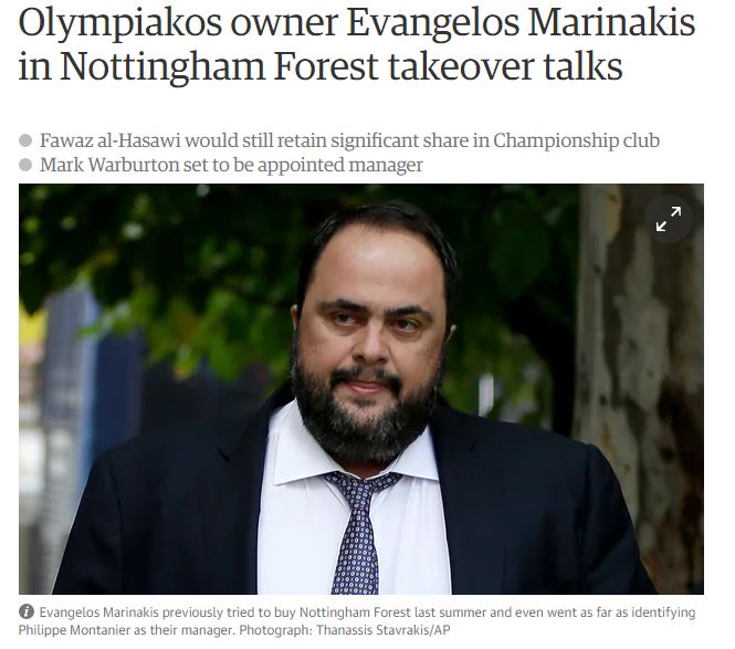 Σε συνομιλίες για την εξαγορά της Nottingham Forest βρίσκεται ξανά ο Βαγγέλης Μαρινάκης, σύμφωνα με δημοσίευμα του Guardian.