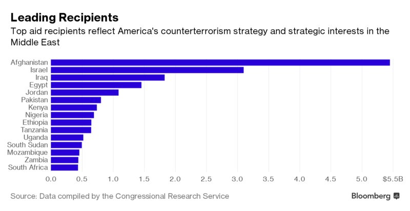 Στην κορυφή του καταλόγου βρίσκεται το Αφγανιστάν, το Ισραήλ, το Ιράκ, η Αίγυπτος και η Ιορδανία, αντανακλώντας την προσπάθεια των ΗΠΑ να σχηματίσουν ένα αντιτρομοκρατικό δίχτυ ασφαλείας και σε άλλους τομείς, πέραν των αμυντικών δαπανών.
