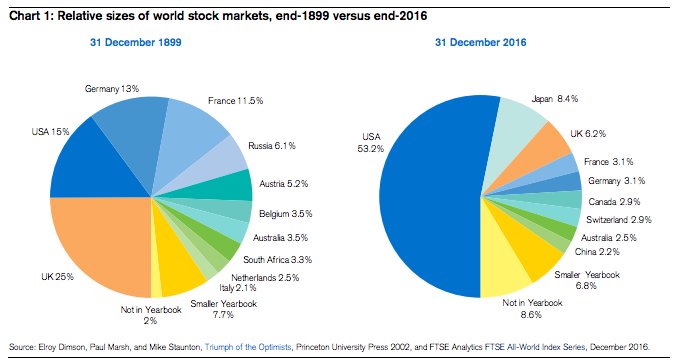 Όπως φαίνεται από τον παρακάτω πίνακα, κάτι παραπάνω από έναν αιώνα πριν, το 1899, οι Η.Π.Α. κατείχαν το 15% της παγκόσμιας αγοράς μετοχών, πίσω από το Ηνωμένο Βασίλειο που κατείχε το ένα τέταρτο.