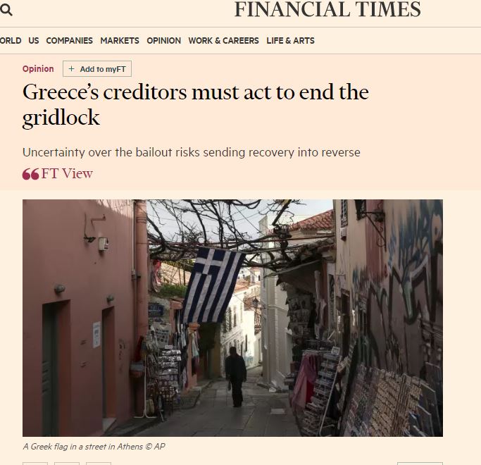 Τη στιγμή που η οικονομική ανάκαμψη στην ευρωζώνη ενισχύεται ακόμα και στις πιο προβληματικές περιοχές, η απελπιστική κατάσταση στην οποία έχει περιέλθει η Ελλάδα γίνεται όλο και πιο εμφανής, επισημαίνουν οι Financial Times με αφορμή τα οικονομικά δεδομένα της χώρας αλλά και τη κατ' αρχήν συμφωνία που επιτεύχθηκε στο Eurogroup της περασμένης Παρασκευής (7/4/2017).