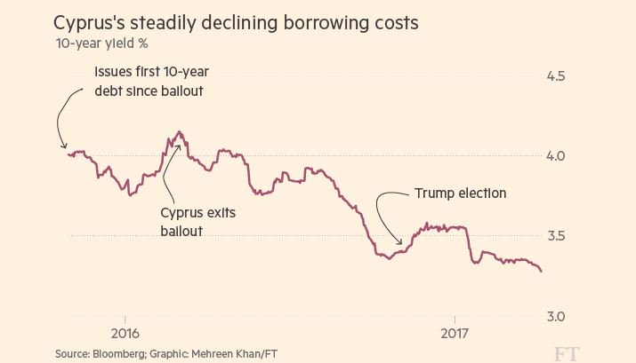 Σε χαμηλό 15ετίας βρίσκεται το κόστος δανεισμού του κυπριακού κράτους, έναν μόλις χρόνο αφότου η μεσογειακή χώρα εξήλθε επιτυχώς από το πρόγραμμα διάσωσης ύψους 10 δισ. ευρώ που εφαρμόστηκε το 2013, με πιστωτές την Ε.Ε. και το Διεθνές Νομισματικό Ταμείο.