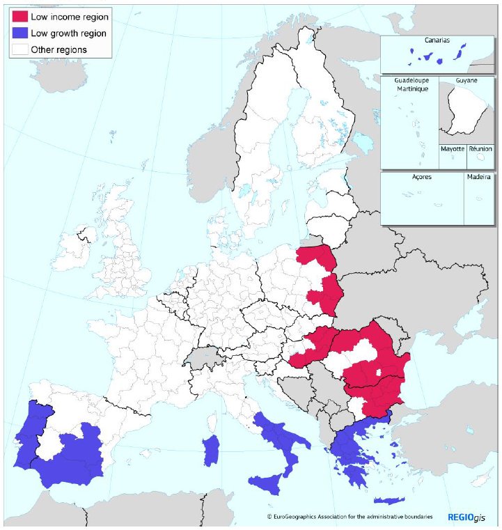 47 περιφέρειες σε οκτώ κράτη μέλη είχαν μελετηθεί και χαρακτηριστεί είτε ως «περιφέρειες με χαμηλούς ρυθμούς ανάπτυξης», με κατά κεφαλήν ΑΕΠ έως 90% του μέσου όρου της ΕΕ αλλά με μακροχρόνια έλλειψη ανάπτυξης, ή ως «περιφέρειες χαμηλού εισοδήματος», όπου το ΑΕΠ αυξάνεται, ωστόσο παραμένει χαμηλότερο από το 50% του μέσου όρου της ΕΕ.