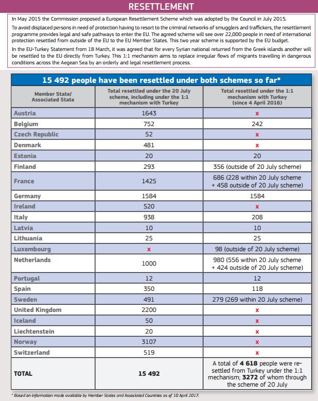 Όσον αφορά την επανεγκατάσταση, τα κράτη - μέλη εξακολούθησαν να σημειώνουν σημαντική πρόοδο, καθώς μέχρι στιγμής έχουν παράσχει ασφαλείς και νόμιμες οδούς σε 15.492 άτομα.