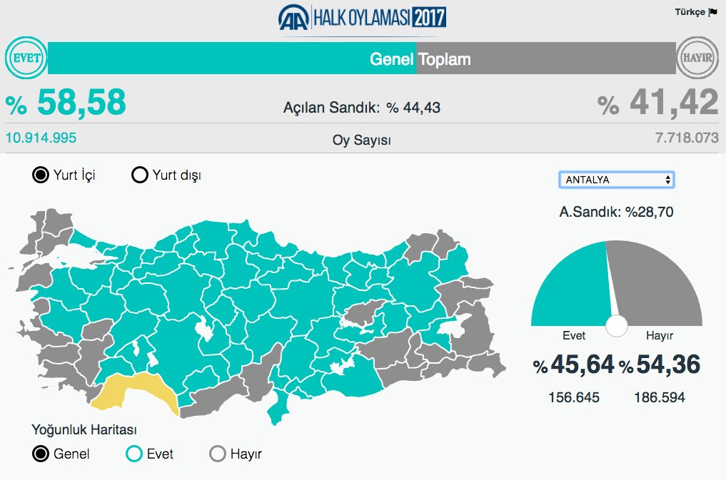 Στο μεταξύ το πρακτορείο Anadolu παρουσιάζει το ΟΧΙ να προηγείται στην Ατάλεια με 54,36% έναντι 45,64%.