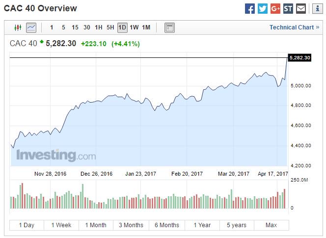 Άλμα 4,4% καταγράφει στο Παρίσι ο CAC 40 στις 5.282 μονάδες, σημειώνοντας την υψηλότερη άνοδο από τον Αύγουστο του 2015.