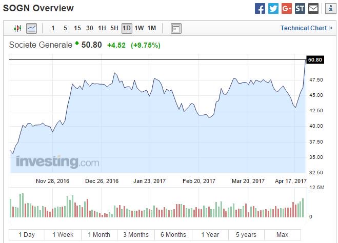 Τη μεγαλύτερη άνοδο κατέγραφαν οι μετοχές των γαλλικών εταιριών και τραπεζών, με τον τραπεζικό δείκτη της Ευρωζώνης να ενισχύεται πάνω από 5% στο υψηλότερο επίπεδο των τελευταίων 16 μηνών ενώ τα blue chips στο Παρίσι ανήλθαν στο υψηλότερο επίπεδο από τον Απρίλιο του 2015.