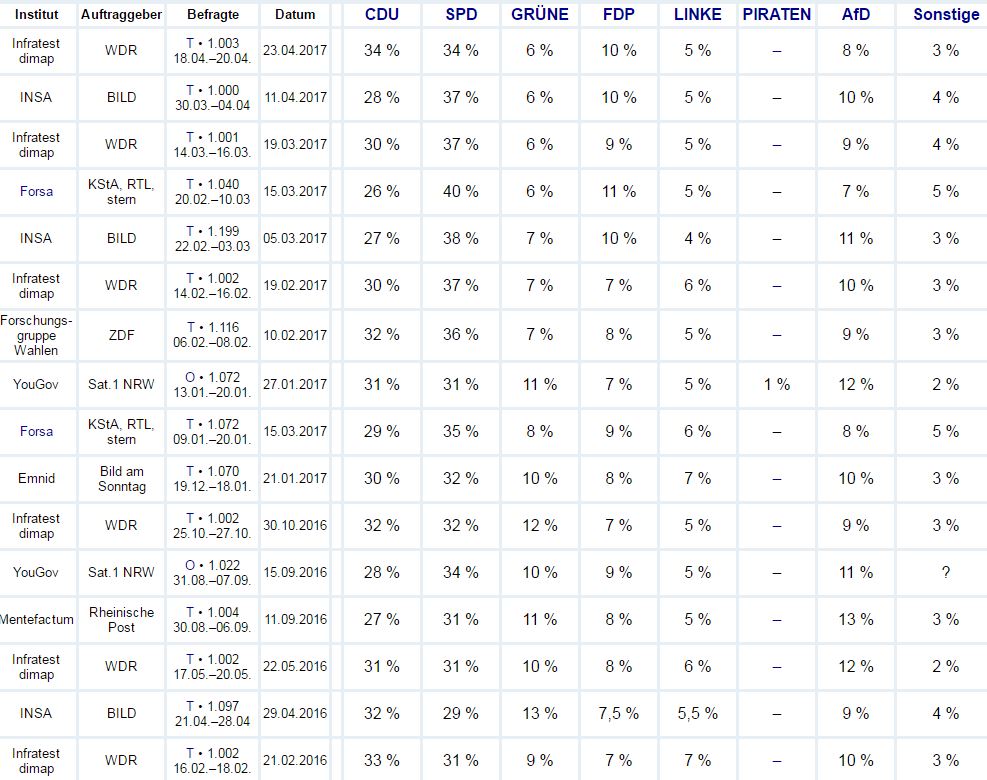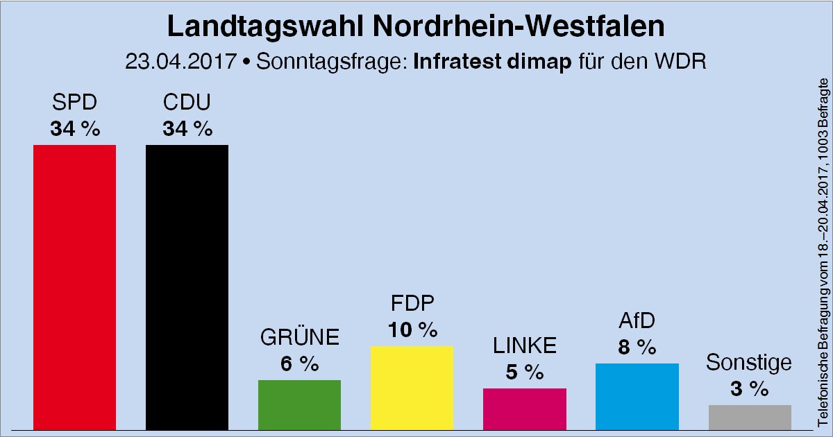Ισοπαλία μεταξύ της Χριστιανοδημοκρατικής Ένωσης (CDU/CSU), της Angela Merkel, και των Σοσιαλδημοκρατών (SPD), του Martin Schulz, διαπιστώνει η δημοσκόπηση του Infratest Dimap.