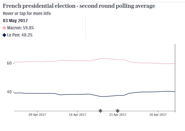 Ακόμα περισσότερο ενισχύεται το ποσοστό του Emmanuel Macron έναντι της Marine Le Pen ενόψει του δεύτερου γύρου των γαλλικών προεδρικών εκλογών που θα πραγματοποιηθούν την Κυριακή 7 Μαΐου 2017.