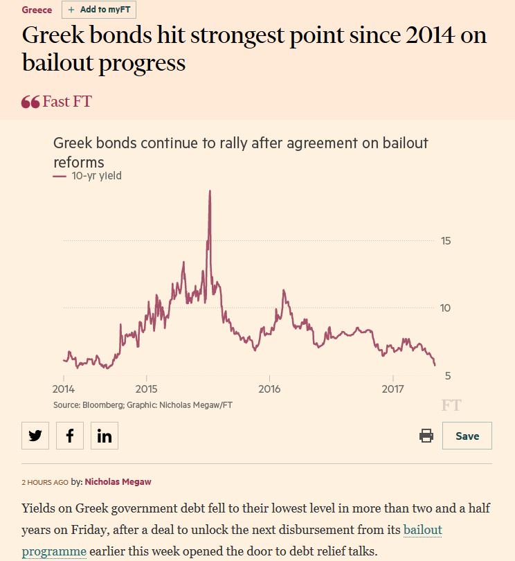 Στο χαμηλότερο επίπεδο των τελευταίων δυόμισι και πλέον ετών υποχώρησαν σήμερα (5/5/2017) οι αποδόσεις των ελληνικών κρατικών ομολόγων, ύστερα από τη συμφωνία της 2ας Μαΐου 2017 που απελευθερώνει την εκταμίευση της επόμενης δόσης από το πρόγραμμα διάσωσης και ανοίγει το δρόμο για τις συνομιλίες ελάφρυνσης χρέους, σύμφωνα με τους Financial Times.
