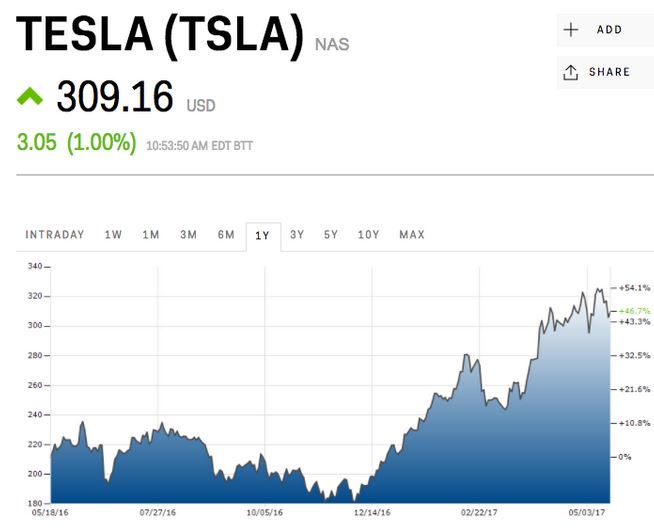 Η τιμή της μετοχή τηςTesla αυξήθηκε το 45% φέτος, φθάνοντας σε υψηλό επίπεδο στις 10 Μαΐου, ενώ υποχώρησε 5% στις 4 Μαΐου, μετά από μια έκθεση που έδειξε ότι έχασεχρηματικά 623 εκατ. δολάρια κατά τη διάρκεια του τριμήνου.