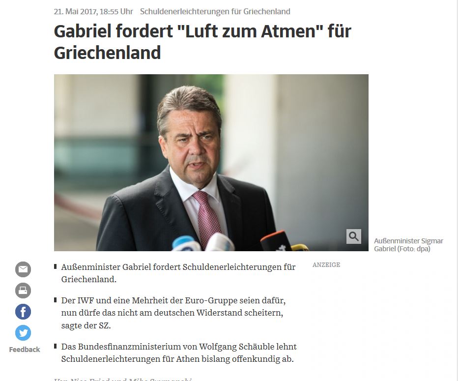 Αυτό δεν πρέπει να αποτύχει εξαιτίας της γερμανικής αντίστασης» υποστήριξε μιλώντας στη γερμανική εφημερίδα Sueddeutsche Zeitung ο Gabriel, ο οποίος άσκησε έμμεση κριτική στον υπουργό Οικονομικών της Γερμανίας Wolfgang Schaeuble, ο οποίος εξακολουθεί να τηρεί σκληρή στάση αν λάβει κανείς υπόψη του πως ο εκπρόσωπος του υποστήριξε ότι δεν πρόκειται να γίνει δεκτή καμία μείωση του ελληνικού χρέους, ούτε επιμήκυνση του χρόνου αποπληρωμής, ούτε και εξαγορά των δανείων του ΔΝΤ από τον ESM.