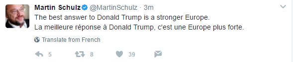 «Η καλύτερη απάντηση στον Donald Trump είναι μία δυνατή Ευρώπη», έγραψε στο Twitter (σε γερμανικά, γαλλικά και αγγλικά...) ο πρώην πρόεδρος του Ευρωπαϊκού Κοινοβουλίου.